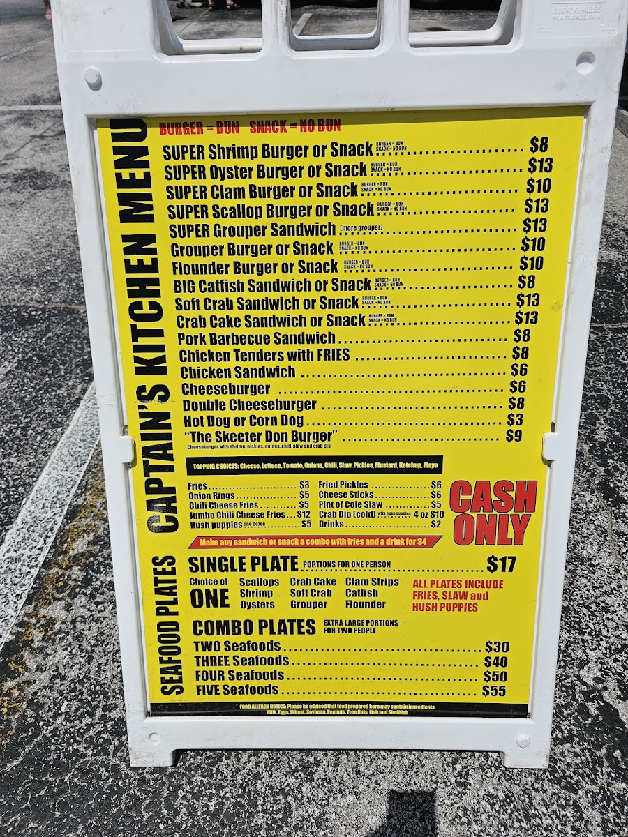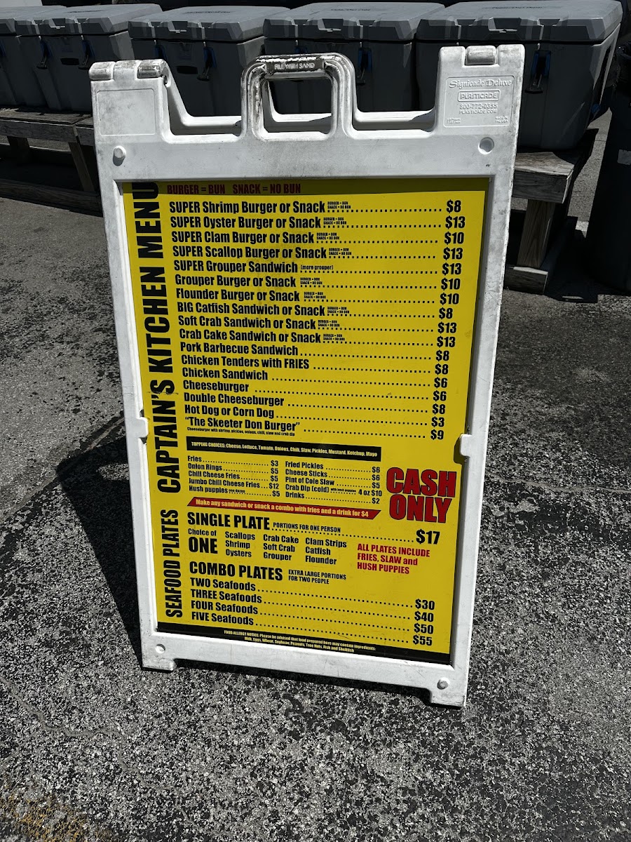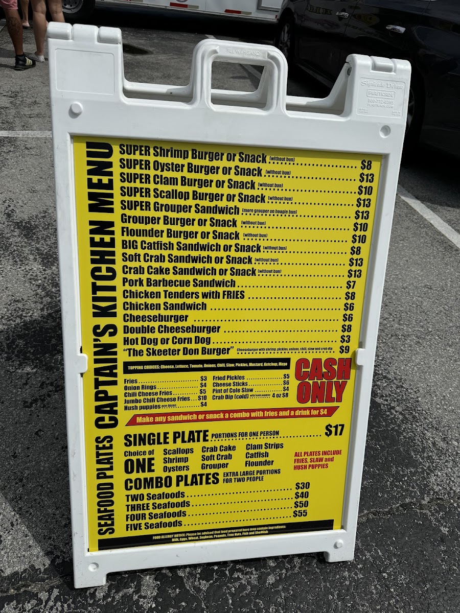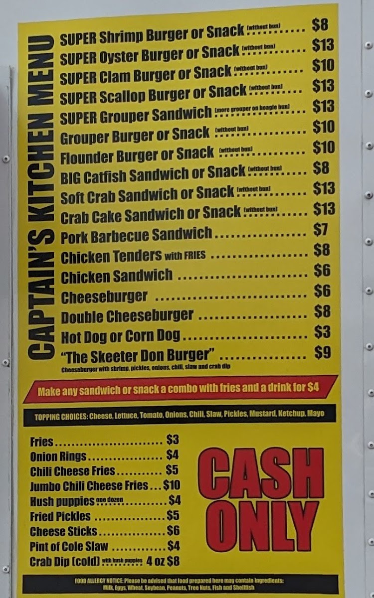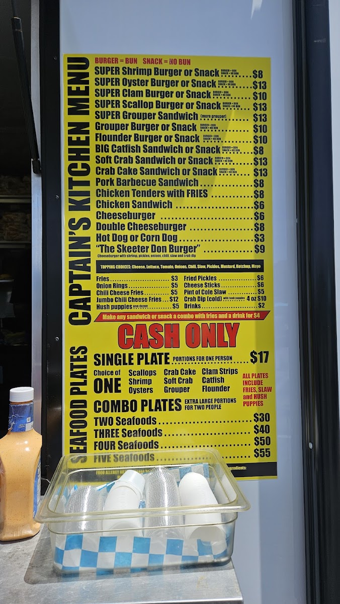 From a reviewer’s perspective, the menu at Captain’s Kitchen Food Truck offers a focused yet satisfying selection that clearly highlights the food truck’s strength in seafood comfort dishes. The Seafood Plates are designed for diners with a hearty appetite, featuring generous options like Large One Seafood, Large Two Seafood, Large Three Seafood, and the impressive XXL Captains Platter, which stands out as a feast-style choice ideal for sharing or for those who want to experience a bit of everything. Moving into the main offerings, the menu balances land and sea well with items such as 3-Pc Chicken Tenders, a reliable classic for non-seafood lovers, alongside a variety of seafood-forward sandwiches and burgers. The Shrimp Burger, Oyster Burger, and Scallop Burger showcase different textures and flavors from the ocean, while the Monster Fish Sandwich lives up to its name by promising a bold, filling option that feels both indulgent and satisfying. Overall, the menu feels thoughtfully curated rather than overwhelming, emphasizing quality portions and familiar flavors that appeal to both locals and visitors. As a conclusion to the dining experience, Captain’s Kitchen Food Truck’s menu successfully communicates its identity: simple, hearty coastal food that lets fresh seafood take center stage, making it a memorable stop for anyone craving classic seafood fare in Indian Beach.