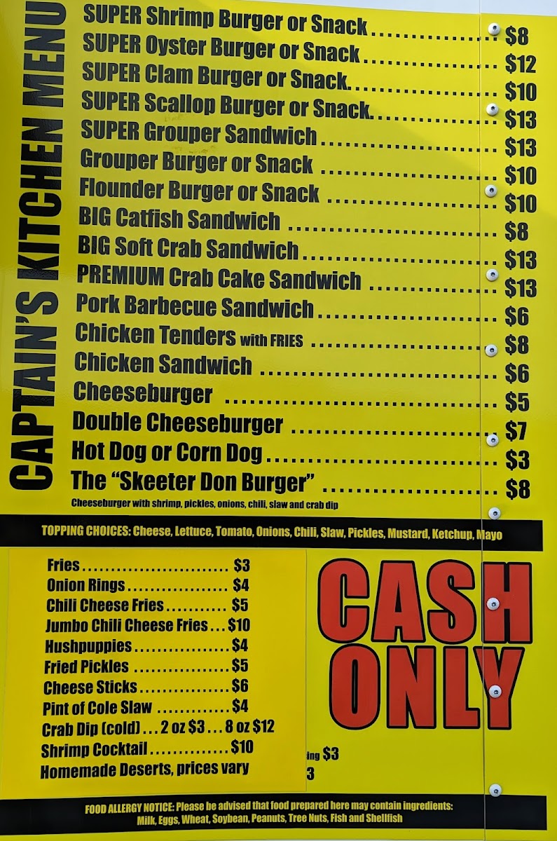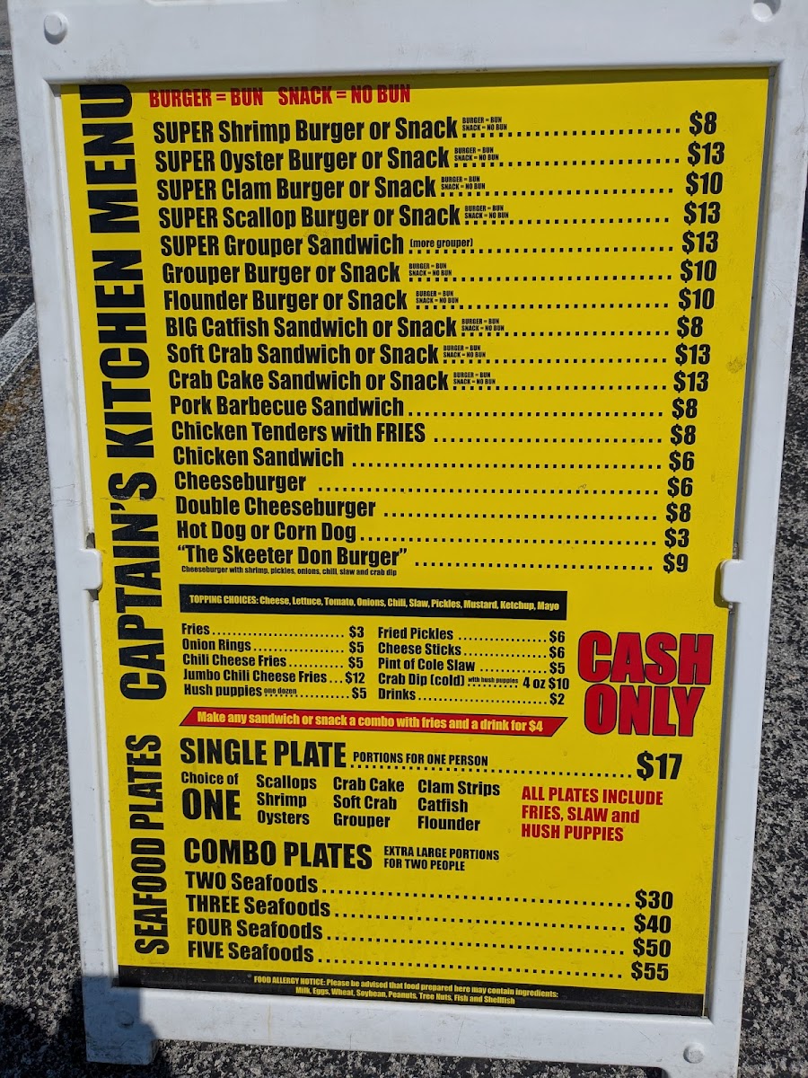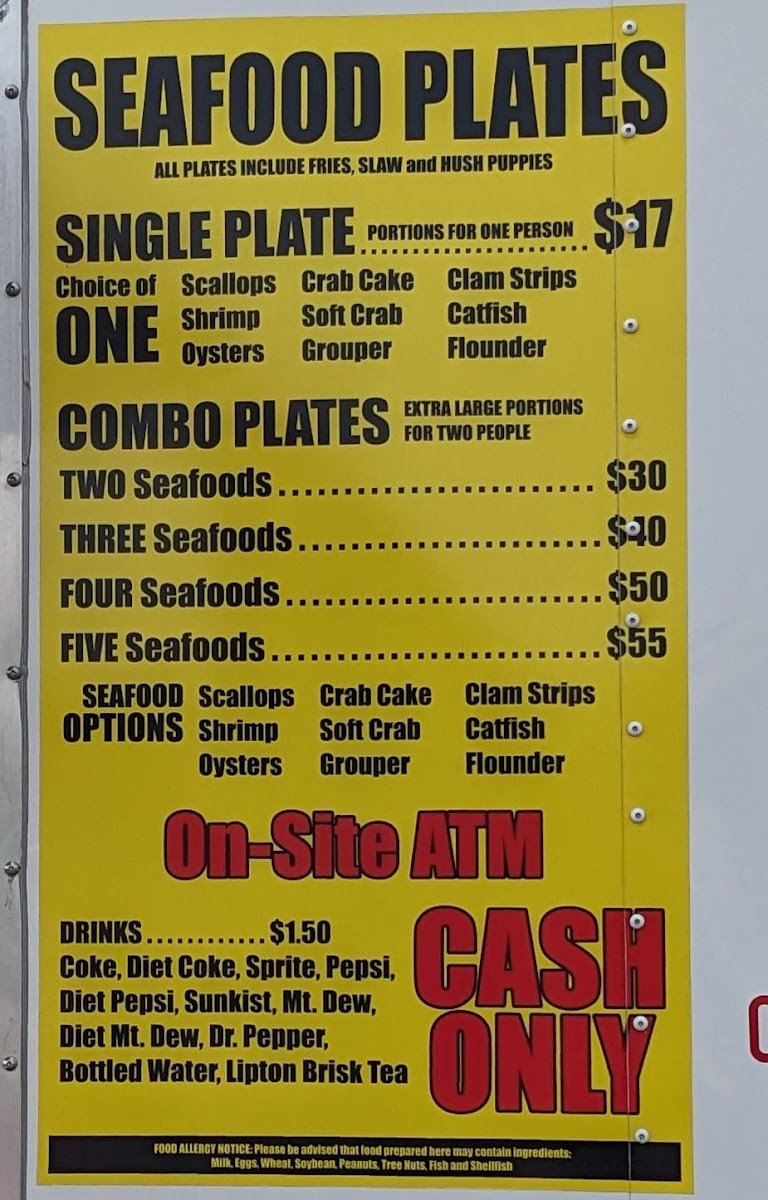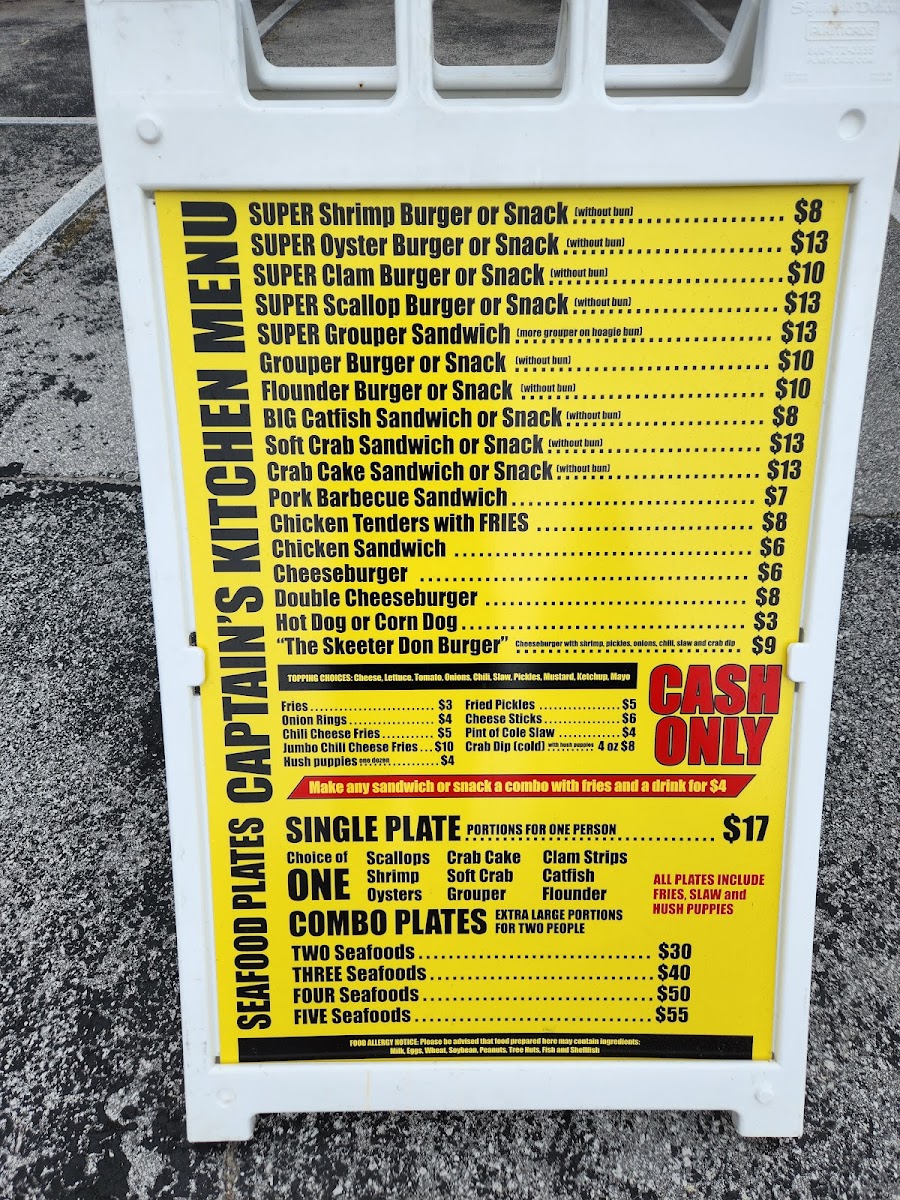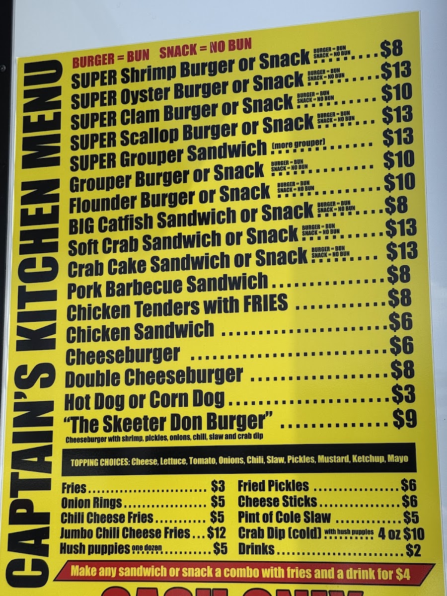From a reviewer’s perspective, the menu at Captain’s Kitchen Food Truck offers a focused yet satisfying selection that clearly highlights the food truck’s strength in seafood comfort dishes. The Seafood Plates are designed for diners with a hearty appetite, featuring generous options like Large One Seafood, Large Two Seafood, Large Three Seafood, and the impressive XXL Captains Platter, which stands out as a feast-style choice ideal for sharing or for those who want to experience a bit of everything. Moving into the main offerings, the menu balances land and sea well with items such as 3-Pc Chicken Tenders, a reliable classic for non-seafood lovers, alongside a variety of seafood-forward sandwiches and burgers. The Shrimp Burger, Oyster Burger, and Scallop Burger showcase different textures and flavors from the ocean, while the Monster Fish Sandwich lives up to its name by promising a bold, filling option that feels both indulgent and satisfying. Overall, the menu feels thoughtfully curated rather than overwhelming, emphasizing quality portions and familiar flavors that appeal to both locals and visitors. As a conclusion to the dining experience, Captain’s Kitchen Food Truck’s menu successfully communicates its identity: simple, hearty coastal food that lets fresh seafood take center stage, making it a memorable stop for anyone craving classic seafood fare in Indian Beach.